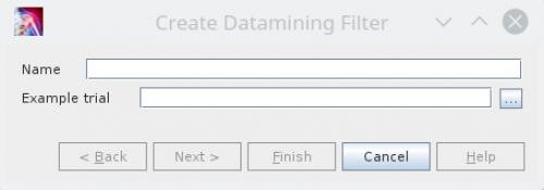 New configuration files can be created by the action „Create datamining filter“ in the Tools menue. A button to execute this action is typically available in the main toolbar. It opens an dialog which asks you for a name used as an filename for the created configuration file and an example trial.