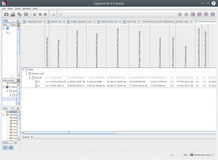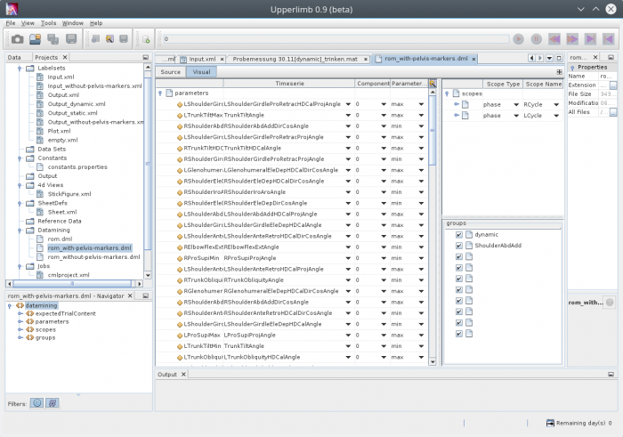 <datamining> <expectedTrialContent> <general defaultFileSuffix="ux"></general> <phaseTypes names="RCycle LCycle RCycleBW RCycleFW LCycleBW LCycleFW"></phaseTypes> <eventTypes names="RTO LG LTO RG RHS LHS GHS GTO"></eventTypes> <timeseries> <timeSerie components="1" name="LGlenohumeralEleDepDirCosAngle"></timeSerie> <timeSerie components="1" name="RShoulderAnteRetroHDCalDirCosAngle"></timeSerie> <timeSerie components="1" name="LShoulderIroAroAngleGlobe"></timeSerie> <timeSerie components="1" name="LShoulderIroAroHDCalAngle"></timeSerie> ... </timeseries> <properties></properties> </expectedTrialContent> <parameters> <parameter component="0" id="RGlenohumeralEleDepHDCalDirCosMax" name="RGlenohumeralEleDepHDCalDirCosAngle" type="max"></parameter> <parameter component="0" id="RShoulderEleDepHDCalDirCosMax" name="RShoulderEleDepHDCalDirCosAngle" type="max"></parameter> <parameter component="0" id="RShoulderAbdAddHdCalDirCosMin" name="RShoulderAbdAddHDCalDirCosAngle" type="min"></parameter> <parameter component="0" id="RShoulderEleDepHDCalDirCosMin" name="RShoulderEleDepHDCalDirCosAngle" type="min"></parameter> ... </parameters> <scopes> <scope id="0" name="RCycle" type="phase"> <variable id="RGlenohumeralEleDepHDCalDirCosMax" name="RGlenohumeralEleDepHDCalDirCosMax"></variable> <variable id="RTrunkObliquityHDCalMax" name="RTrunkObliquityHDCalMax"></variable> <variable id="RShoulderAbdAddHDCalProjMin" name="RShoulderAbdAddHDCalProjMin"></variable> <variable id="RShoulderAbdAddHdCalDirCosMin" name="RShoulderAbdAddHdCalDirCosMin"></variable> ... </scope> ... </scopes> <groups> <group fileSuffix="c3d" id="ShoulderAbdAdd" selected="true"></group> <group fileSuffix="c3d" id="ShoulderAnteRetro" selected="false"></group> <group fileSuffix="c3d" id="AroIro-0" selected="false"></group> <group fileSuffix="c3d" id="Schuerzengriff" selected="false"></group> <group fileSuffix="c3d" id="Kaemmen" selected="false"></group> ... </groups> </datamining>