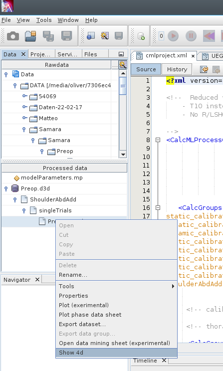 The next step in a typical workflow includes visualization of the processed data as a 3d-view and as a sheet of plots e.g. of joint angles. To do this open the tree of the output d3d-file, select a trial, open the context menu with a right-click and choose an action. Have a carefully look at the data, Sometimes you can see artefacts based on errors in the proprocessing of the data. Than you have to work on the rawdata with e.g. relabeling in the case of an markerbased system, setting of events, etc. and than you have to process the data again with the „Upperlimb“ software. It can happen that you work in one or more of these cyclces.
